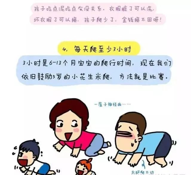 總結(jié):爬行是一項長期的任務,需要堅持,即使是冬天氣溫過低時,家長應該在家里辟出一塊寶寶爬行“自留地”,幫助寶寶爬行。