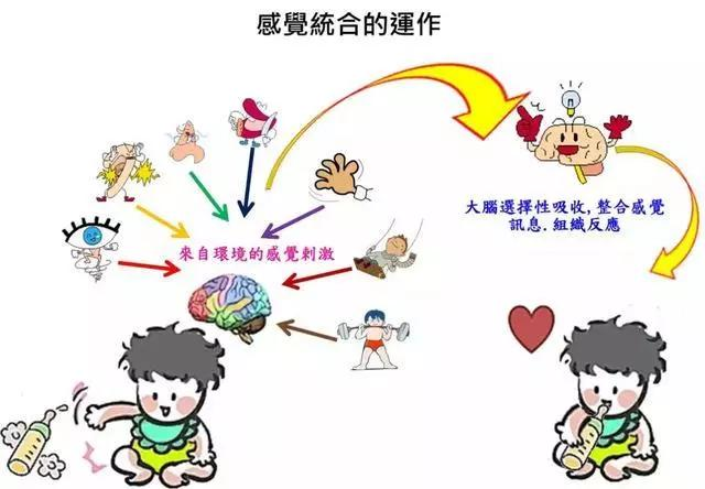 ? 感統對兒童的影響 知道了感統失調的原因,那感覺統合失調對兒童有怎樣的影響呢?下面我們用一副圖簡單了解一下吧。 我們怎么知道孩子是否有必要接受相關專業人員的評估,以明確孩子是否存在感統失調呢? 這里有三個尋求專業醫生幫助的正常理由: 1.如果孩子在某些“很自然的行為”方面做的很吃力,需要考慮尋求幫助。 行為問題包括:在地上爬、跑步、跳躍、攀爬、講話、聆聽、擁抱和玩耍行為吃力,那就表示孩子是需要進行感統方面的診斷了;如果他們是很自卑的,那答案也是肯定的,自卑是感統失調的明顯信號。 2.孩子的問題若對其他人造成了干擾,也需要考慮尋求專業幫助。 這些孩子在推倒別人時,會讓別人很煩;焦躁不安時會令老師很生氣,行為莽撞時會令父母擔心,但他們不知道自己為何總讓人不開心。如果孩子在家里(安全的場所)時天使,到了街上(無法預期且令人害怕的場所)卻變成魔鬼;在學校時天使(懂得自制),回到家里卻變成惡魔(一整天下來把他們累壞了);如果他們換了一個場合就好像變了個人似的,這也可能表示他們在發送求救信號。 ? 什么是感覺統合 感覺統合簡稱感統,是機體將各種感覺通路的信息輸入大腦,經過大腦對輸入信息進行加工、處理、解釋、比較、增強、抑制、聯系、統一,神經系統的不同部分才能協調整體工作,使個體與環境順利接觸,并作出適應性反應的能力.感統包括視覺、聽覺、味覺、嗅覺、觸覺、前庭覺和本體覺。感統是人類智慧的基礎,是孩子一切能力發展的根本。 對于那些感統失調極為嚴重的孩子來說,接受治療時相當重要的。對孩子進行感統治療,可以幫助孩子加工處理自己的各種感覺,讓孩子的神經系統更好地完善;可以提供孩子必備的生活能力,也能為孩子的未來奠定堅實穩定的基礎,才能勇敢地面對未來人生中的各種挑戰;可以幫助孩子順利地發展社交能力;可以讓孩子學習更有效率;還能夠改善孩子的情緒狀況和與家人之間的關系。