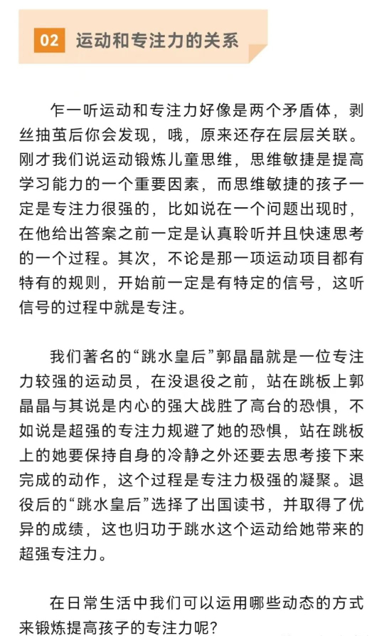 以動制靜策略 制定規則、明確目標 不論是在家中還是在課堂都可以利用兒童發展天性,學會用游戲來提高專注力,前提一定要制定可執行規則。比如說聽到書,就要找到與書相關的物體但是不可以拿書;聽到籃球,就要找到與籃球同類的物體但是不可以拿籃球...增強傾聽專注力和思維靈敏。 提高自控、增強執行 執行力需要自控,而自控需要專注力,抑制內心的沖動,學會冷靜思考。在日常生活中我們可以這樣做,明確分配每一位家庭成員的家務任務,需要在規定時間內完成,并且由所有家庭成員認可通過后才可以獲得觀看漫畫書或者動畫片的權利。長期養成習慣提高執行力,且通過規則等待提高自控力。 多變引導、刺激興趣 為什么孩子看動畫片、玩游戲可以紋絲不動,可是一寫起作業就東張西望;玩樂高能玩1小時,看書堅持不了10分鐘?孩子的專注力不夠還有另外一個因素就是興趣,如果孩子對看書不感興趣,再怎么逼都沒有,不光是孩子,成人也是一樣。那我們在日常生活和課堂中可以經常變化玩法,比如減少看電視時間可以一起出去拿快遞;上課坐不住了可以穿插不同小游戲,還可以通過聲音變化、服飾變化引起孩子關注······最終的目的要將孩子的無意注意轉化為有意注意。多變化式引導,尋找孩子的興趣點。 但心理學上,專注力的關聯還有很多方面,如注意力和認知能力有關,和視覺搜索有關,和情緒有關等等。我們需要多理解和接納孩子。生活因動而有趣,因多變而精彩,注意動靜結合,也要學會以動制靜,不要一昧的壓制打造一個“坐如泰山”的孩子。